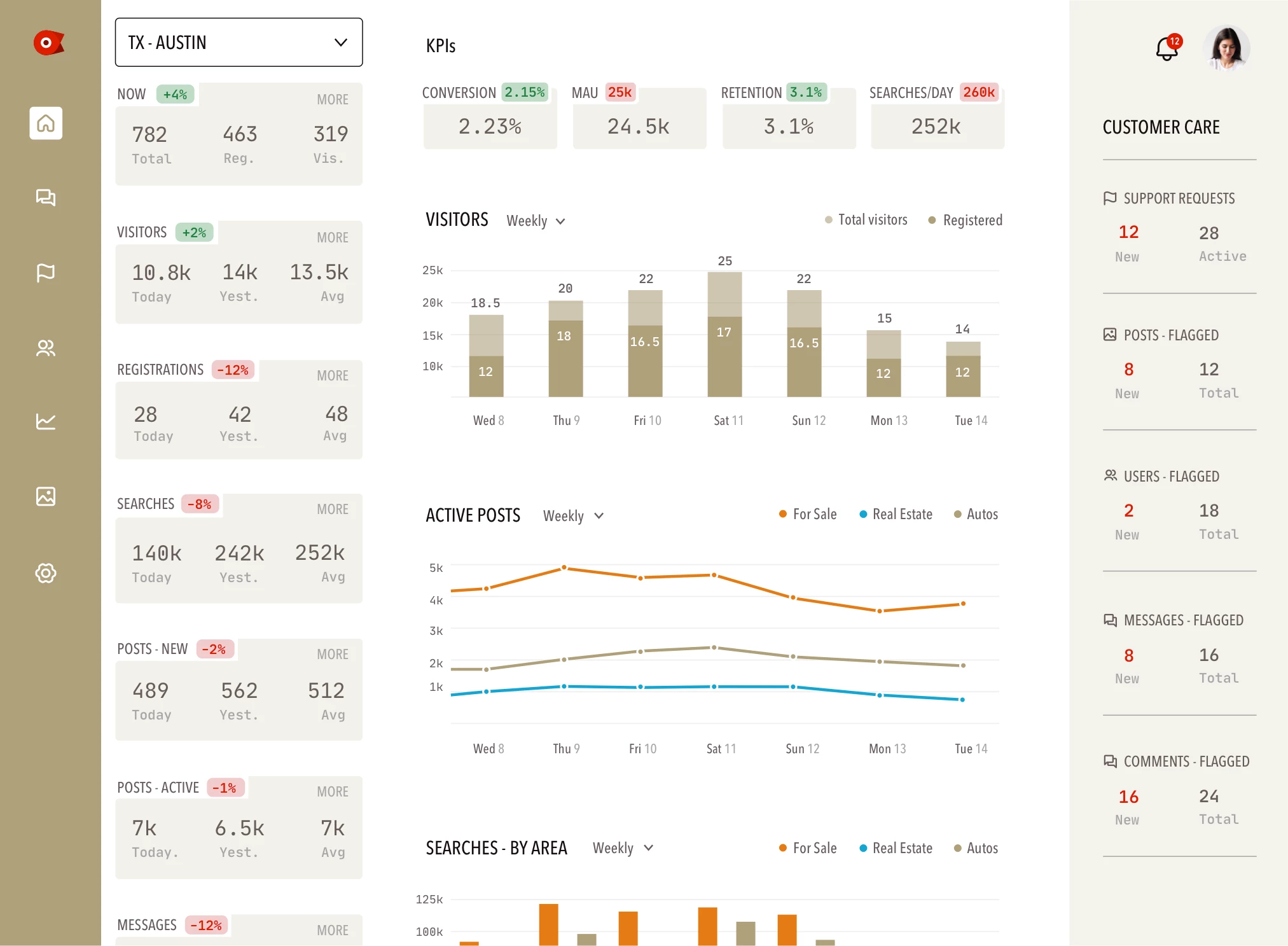 The dashboard highlights our KPIs with comparative data in the sidebar and quick links to critical areas