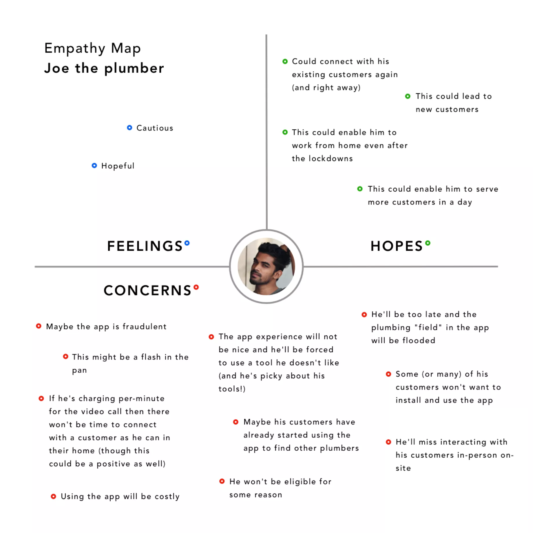 In our two-sided market model, we needed advisors to be engaged and online first, which could feel like a risk to them. Based on our user stories I revised the standard empathy map to focus on Feelings, Hopes, and Concerns