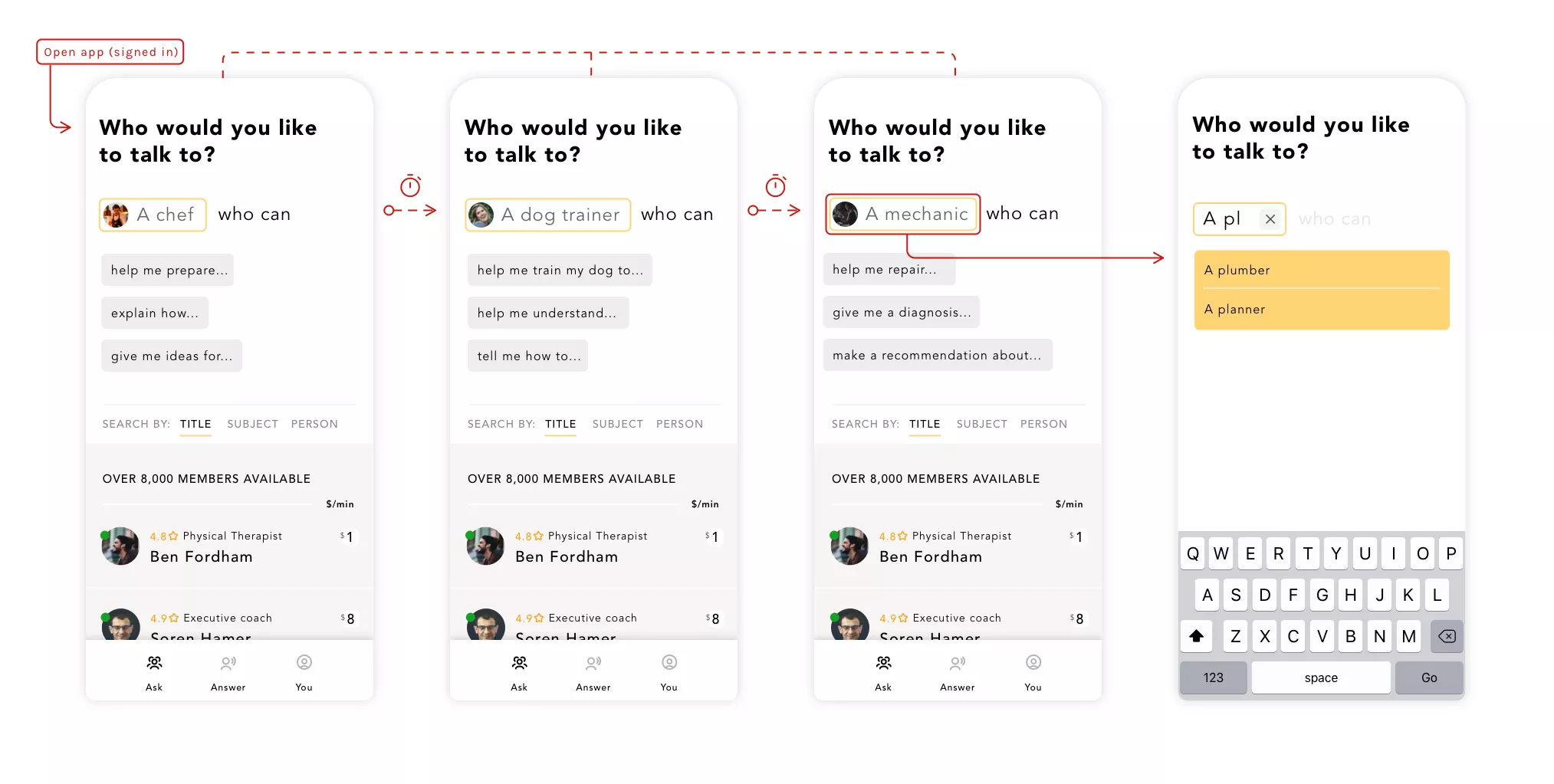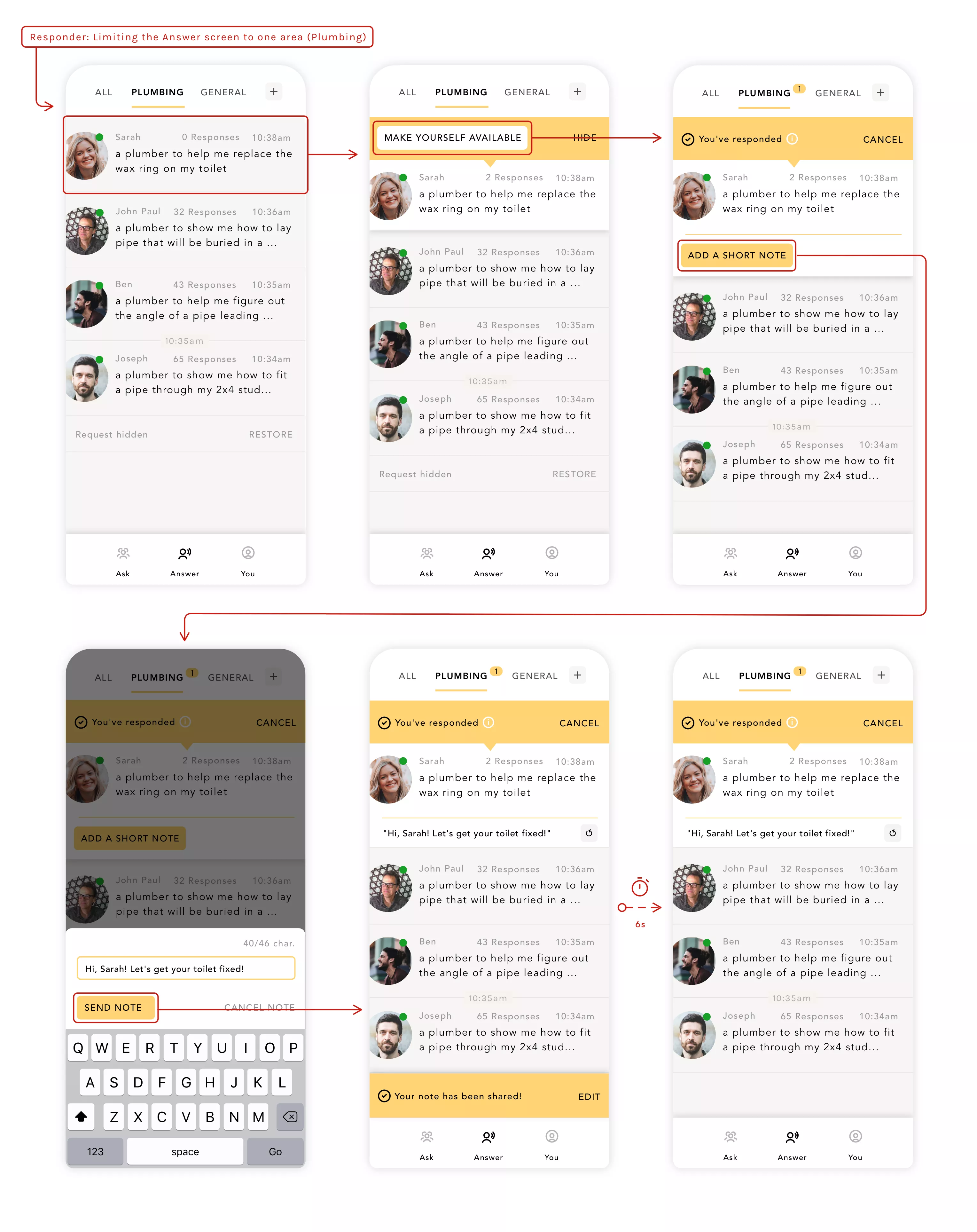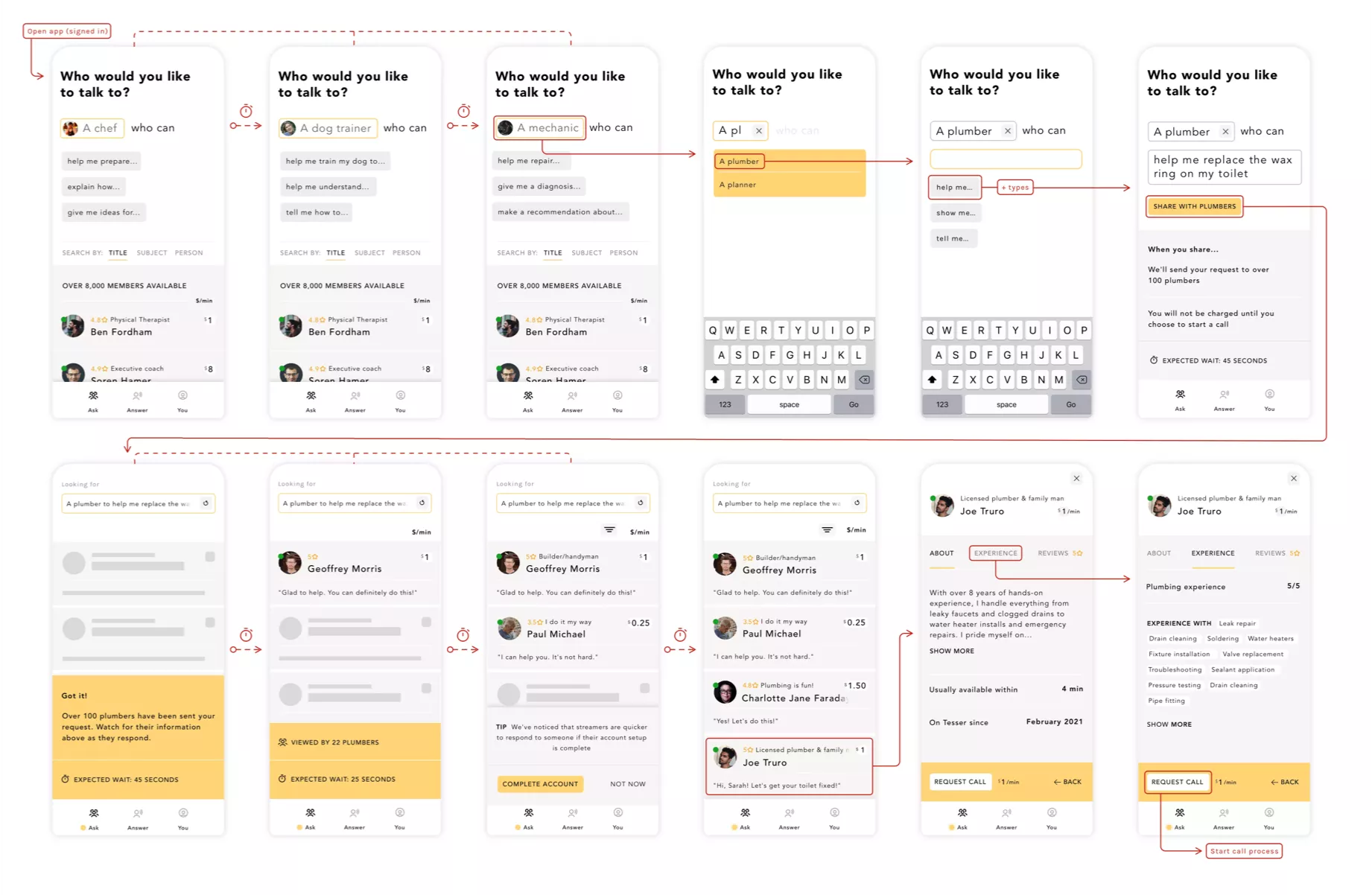 Any member can request help by posting their need to experts in the related field who can make themselves available for a video call in real-time. With a variety of needs, the product flow balances flexibility with a clear linear process for both parties.